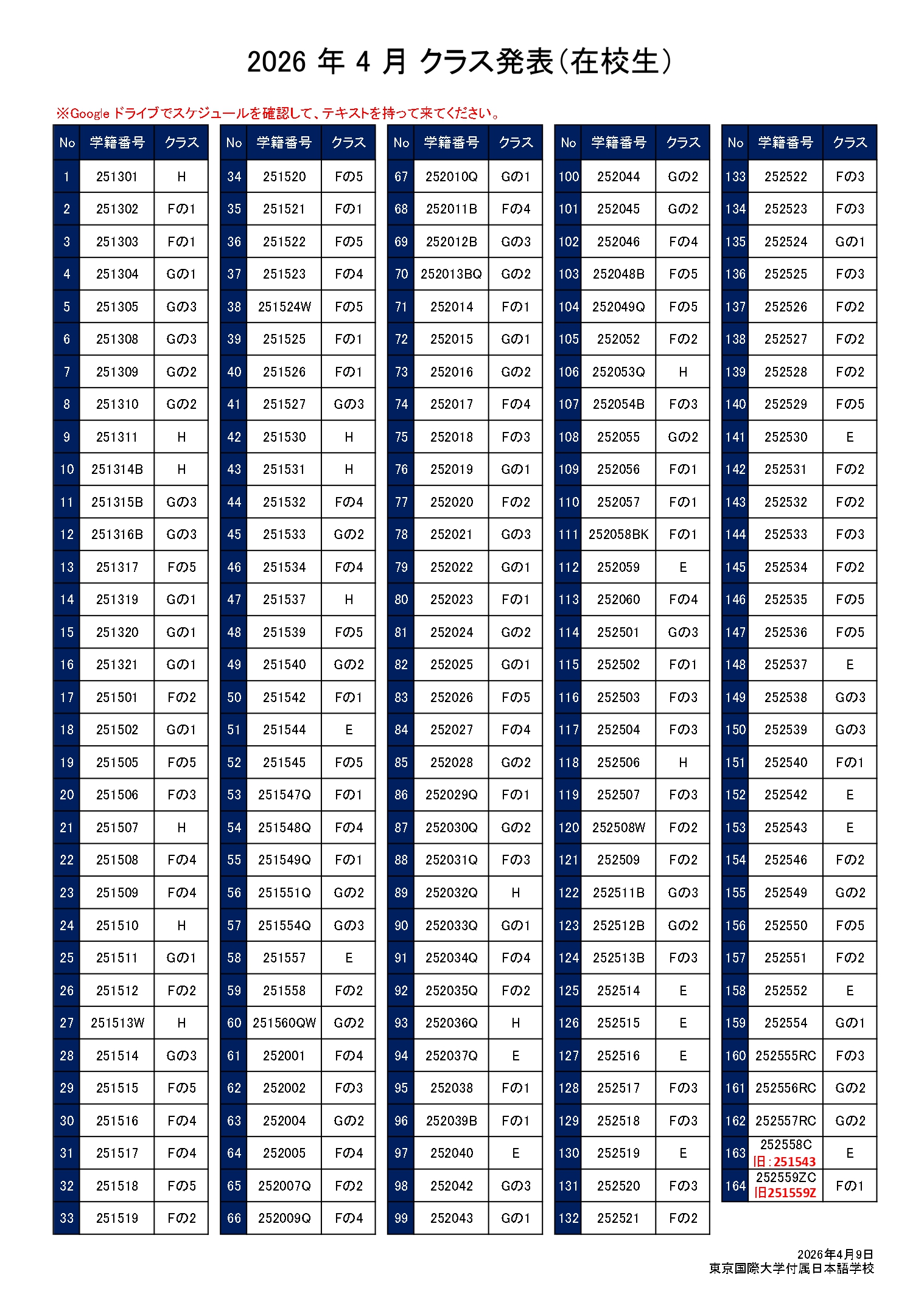 2026 年 4 月 クラス発表(在校生)